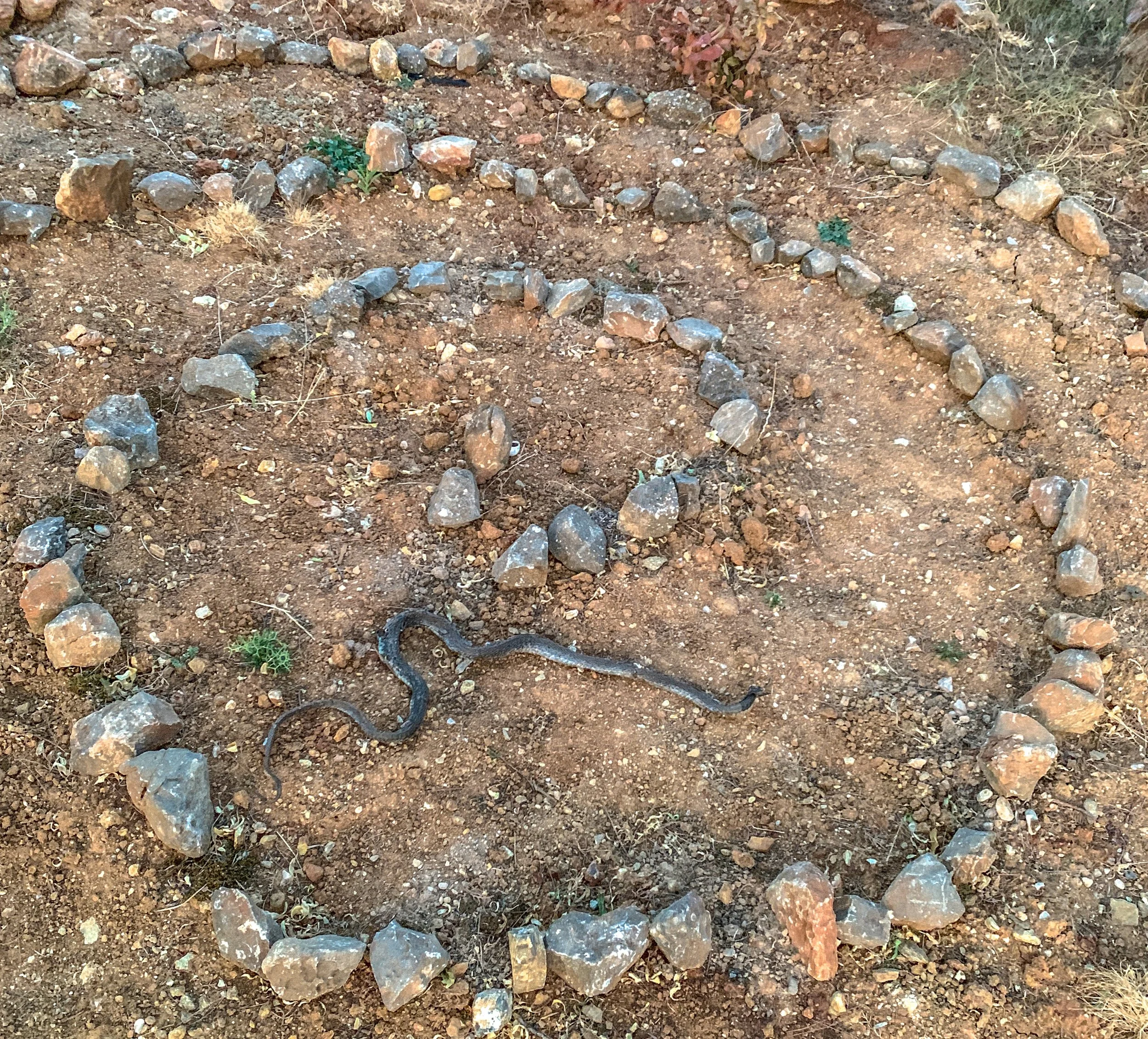 A snake, head removed, body whole, lay carefully placed on Lily’s grave. I don’t say that lightly — it felt placed, as if by invisible hands or wings. I later intuited that a snake eagle, symbol of powerful vision, had caught the serpent but was chased away by crows, dropping it exactly where I would find it.